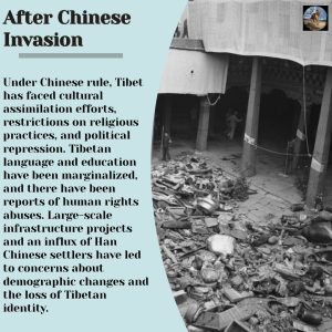After the Chinese invasion in the 1950s, Tibet has faced cultural assimilation efforts, restrictions on religious practices, and political repression. Tibetan language and education have been marginalized, and basic Human Rights have been compromised on a great many levels.