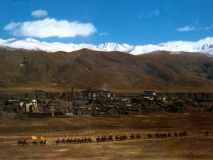 1958: A wonderful scenic shot of the great Lhagyari palace at E-Yul in Lhoga, Tibet with a Column of Chushi Gang Druk fighters riding before it.