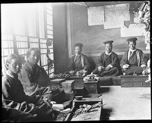 The three magistrates of Shol, Lhasa with clerks on left in their Court Room. Documents can be seen around the room.