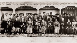 Commander in Chief of Tibetan army , Dasang D Tsarong in center with ministers, commanders of the regiment, army officers , government officials and servants at the back of the photo. Circa 1922.