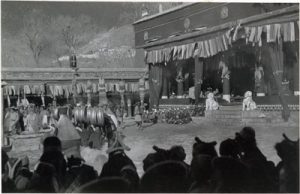 Nechung monastery during Tibetan New Year, February 14th, 1937. Drepung Monastery can be seen in the background. Officials can be seen entering the courtyard to take their seats in the background on the left.
