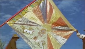 Rare Tibetan Flag, 1949 Screenshot of the Tibetan National Flag from footage filmed by Lowell Thomas’ visit to Tibet in 1949. This is a rare example of the Tibetan flag, which appears to be made from brocade fabric.