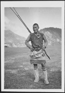 A VERY RARE PHOTO OF TIBETAN SILVER-MOUNTED MATCHLOCK GUN (ME-DA) FROM THE 20TH CENTURY.
