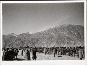 Tibetan uniformed soldiers ranked with bayoneted rifles waiting to be reviewed by Basil Gould. He discussed British military aid to Lhasa and inquired about the creation of a British office in Lhasa, but the Tibetan government rejected this.