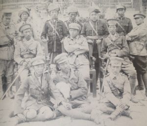 A group of Tibetan army officers with Tsarong Dasang Damdul seated in the center. The photo was likely taken in Lhasa.