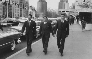 Tibetan government officials Rinchen Sadutshang, Tsipon Wangchuk Deden and Gyalo Thondup, the Dalai Lama‘s older brother in front of the United Nations in September 1959. The delegation made three such trips to the UN, in 1959, 1960, and 1961, to seek support for Tibet.
